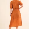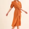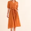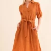 Waffle Textured Ribbon Waist Midi Dress – Caramel