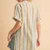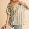 Side Slit Striped Short Sleeve Blouse – Blue Green