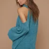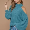 Belle Sweater Knit Open One Shoulder Turtle Neck – Teal