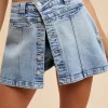Button Detail Stretch Denim Wrap Mini Skort – Medium Washed Denim