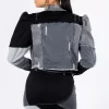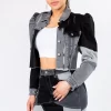 The Button Up Cropped Patchwork Denim Jacket features a cropped length design with denim patchwork and a frayed edge hem for a trendy and unique look. The puff shoulder trims add a touch of volume and style to the jacket. With a button front closure, this jacket is a fashionable and eye-catching addition to your wardrobe.