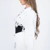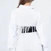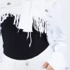 A distressed denim jacket with a frayed hem features a cropped length, button closure front with a frayed hem, and distressed trims. This stylish piece offers a trendy and edgy twist on the classic denim jacket style. The cropped length gives it a modern and versatile look that pairs well with high-waisted bottoms. The button closure front, complete with a frayed hem, adds a touch of casual charm and a laid-back vibe. Additionally, the distressed trims provide a worn-in and vintage-inspired feel that adds character to the jacket. Perfect for layering over a variety of outfits, a distressed denim jacket with a frayed hem is a must-have wardrobe staple for those looking to achieve a chic and effortless style.