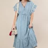An embroidered boho ruffled midi dress is a stylish piece that combines intricate stitching with flowing ruffles in a medium-length silhouette. This dress embodies a bohemian aesthetic with its detailed embroidery and playful ruffle accents. Perfect for casual or dressy occasions, it offers a chic and unique look for those who love bohemian-inspired fashion.