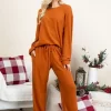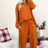 Full Size Fuzzy Hacci Brush Round Neck Top and Pants Lounge Set – Rust