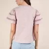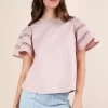 A lace trim sleeve top is a feminine and elegant piece that adds a touch of sophistication to any outfit. The delicate lace trim detailing on the sleeves gives the top a romantic and soft look, perfect for both casual and dressier occasions. This type of top can be styled in various ways – pair it with high-waisted jeans for a chic and casual look, or dress it up with a skirt or dress pants for a more polished ensemble. The lace trim adds a subtle and pretty detail to the top, making it a versatile and stylish addition to your wardrobe.