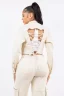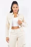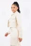 A laced back cropped jacket is a stylish garment with a button front closure, cropped length, and intricate lace detailing on the back trims. This fashionable piece combines classic elements with a modern twist, making it a versatile addition to your wardrobe. The button front closure provides a secure and adjustable fit, while the cropped length offers a trendy silhouette that pairs well with high-waisted bottoms. The laced back trims add a touch of sophistication and femininity to the jacket, making it a standout piece for any occasion. Whether dressed up or down, a laced back cropped jacket is sure to elevate your look with its blend of elegance and contemporary style. Add this chic jacket to your collection for a fashion-forward statement piece that exudes charm and versatility.