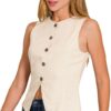 A linen button-down vest is a versatile and stylish piece that can be worn in various ways to elevate your outfit. The linen fabric makes it lightweight and breathable, perfect for warm weather or layering during cooler seasons. The button-down design adds a sophisticated touch, and you can dress it up or down depending on the occasion. Pair it with a blouse and trousers for a chic workwear look, or wear it over a dress or with jeans for a casual yet polished ensemble. The vest can also be worn open or closed, giving you options to style it according to your preference. Overall, a linen button-down vest is a great addition to your wardrobe for adding an extra layer of interest and style to your outfits.