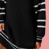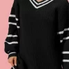 Loose V Neck Sweater Dress with Striped Sleeves – Black