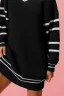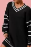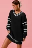 Loose V Neck Sweater Dress with Striped Sleeves – Black