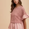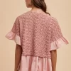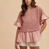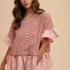 Add a touch of sophistication to your outfit with this mix media ruffle textured knit top. The mix of materials adds visual interest and texture to the top. The ruffle detailing offers a feminine and elegant touch. Perfect for dressing up a casual look or adding a chic element to your workwear. Pair with trousers or a skirt for a stylish and polished ensemble. Embrace a trendy and versatile style with this unique and flattering knit top.