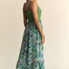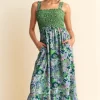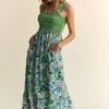 Multi Smocked Bodice Geo Ruffle Strappy Midi Dress – Hunter Green