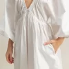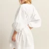 Plunge Balloon Sleeve Poplin Mini Dress with Pockets – White