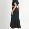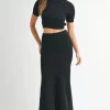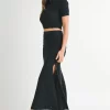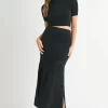 Pointelle Short Sleeve Crop Top and Slit Skirt Sweater Set – Black