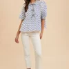 Embroidered Split Neck Puff Sleeve Blouse – Ivory/Black