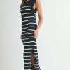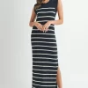 Sleeveless Stripe Sweater Maxi Side Slit Dress – Navy