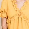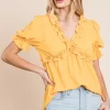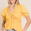 Solid Ruffled Deep V-Neck Puff Sleeve Babydoll Top - Mango