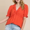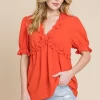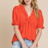 Solid Ruffled Deep V-Neck Puff Sleeve Babydoll Top – Orange