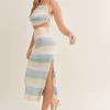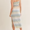 The striped knit cami and midi skirt set is a trendy and coordinated outfit that offers both style and comfort. The striped pattern adds a chic and playful touch to the ensemble, creating a fun and stylish look. The cami top provides a breezy and effortless feel, perfect for warm weather days. Paired with the coordinating midi skirt, this set offers a polished and put-together appearance that is versatile for various occasions. Whether worn together or as separates, this set is a versatile addition to your wardrobe. Effortlessly chic and fashionable, the striped knit cami and midi skirt set is a must-have for those seeking a coordinated and on-trend outfit option.