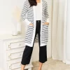 This striped open-front longline cardigan is a stylish and versatile piece for your wardrobe. The timeless striped pattern adds a touch of sophistication, while the open front design and longline silhouette create a relaxed and effortless look. Whether paired with jeans for a casual day out or layered over a dress for a more polished ensemble, this cardigan is perfect for adding a fashionable layer to any outfit.