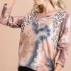 Tie Dye Distressed Knit Top with Leopard Shoulder – Rust/Charcoal