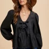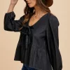 Tie Front Peplum Long Sleeve Denim Top – Black