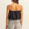 The trendy Strapless Bubble Top is a stylish and chic piece that features a strapless design and a bubble hem for a modern look. This top adds a touch of elegance and sophistication to any outfit, making it a versatile choice for various occasions.