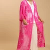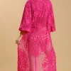 Umgee Full Size Floral Lace Open Front Long Kimono with Waist Tie Plus Size – Hot Pink