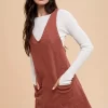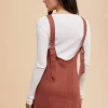 V-Neck Adjustable Strap Denim Overall Dress With Pockets – Rust