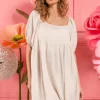 Washed Linen Tiered Midi Dress with Puff Sleeves – Natural